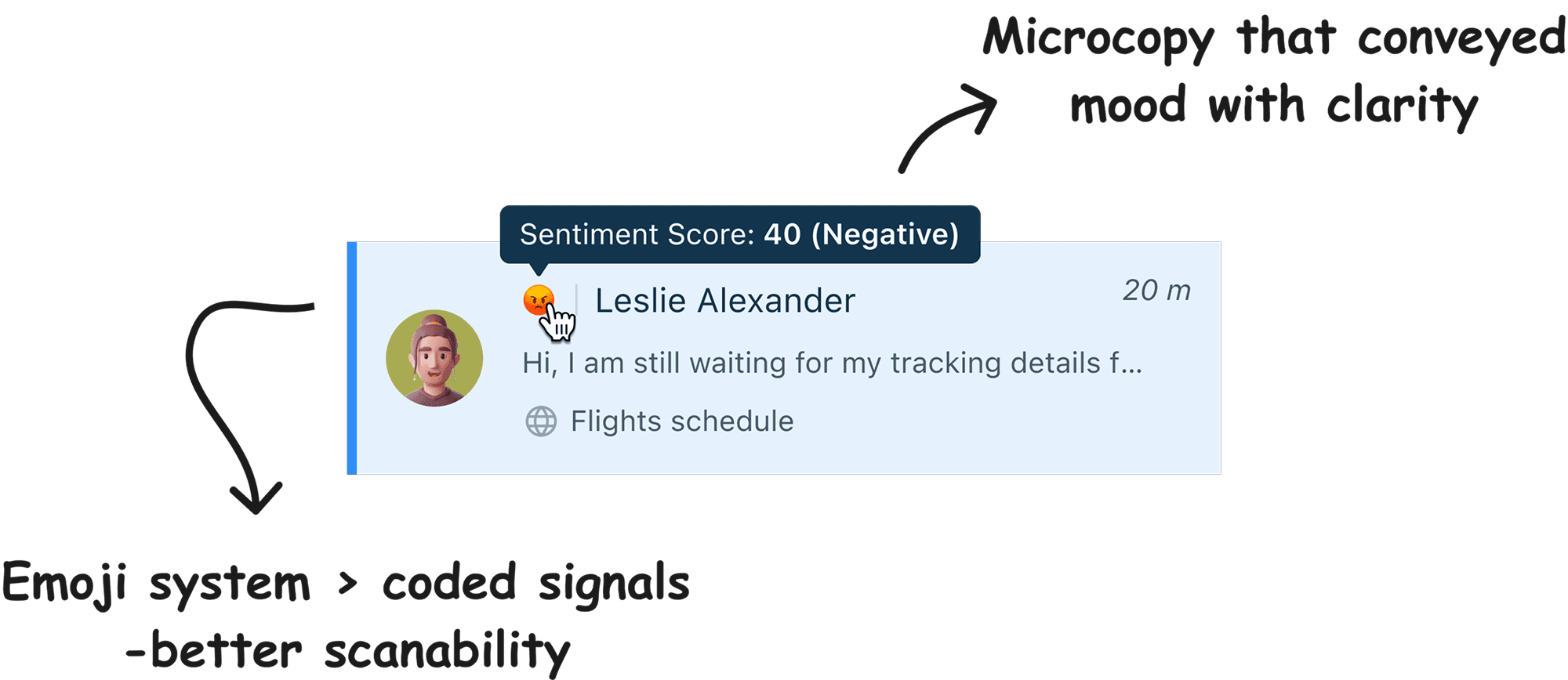 Agents started relying on the sentiment system within the first week of rollout. The emoji approach worked because it matched their existing mental models as they didn't have to learn a new visual language under pressure.