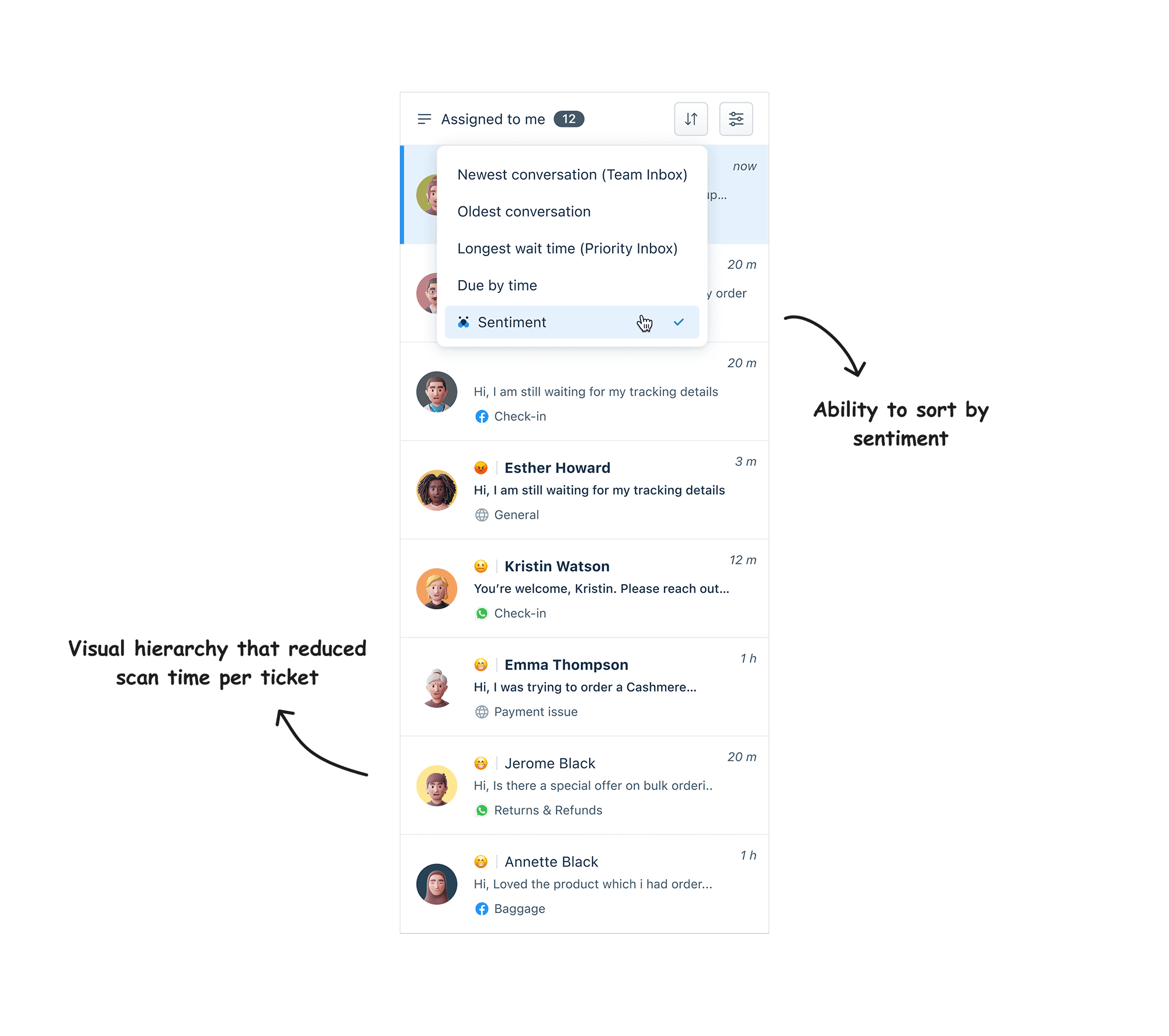 Made it effortless to understand: The emoji system required zero learning curve. Agents saw 😟 and immediately knew "this customer is upset" without having to decode anything.