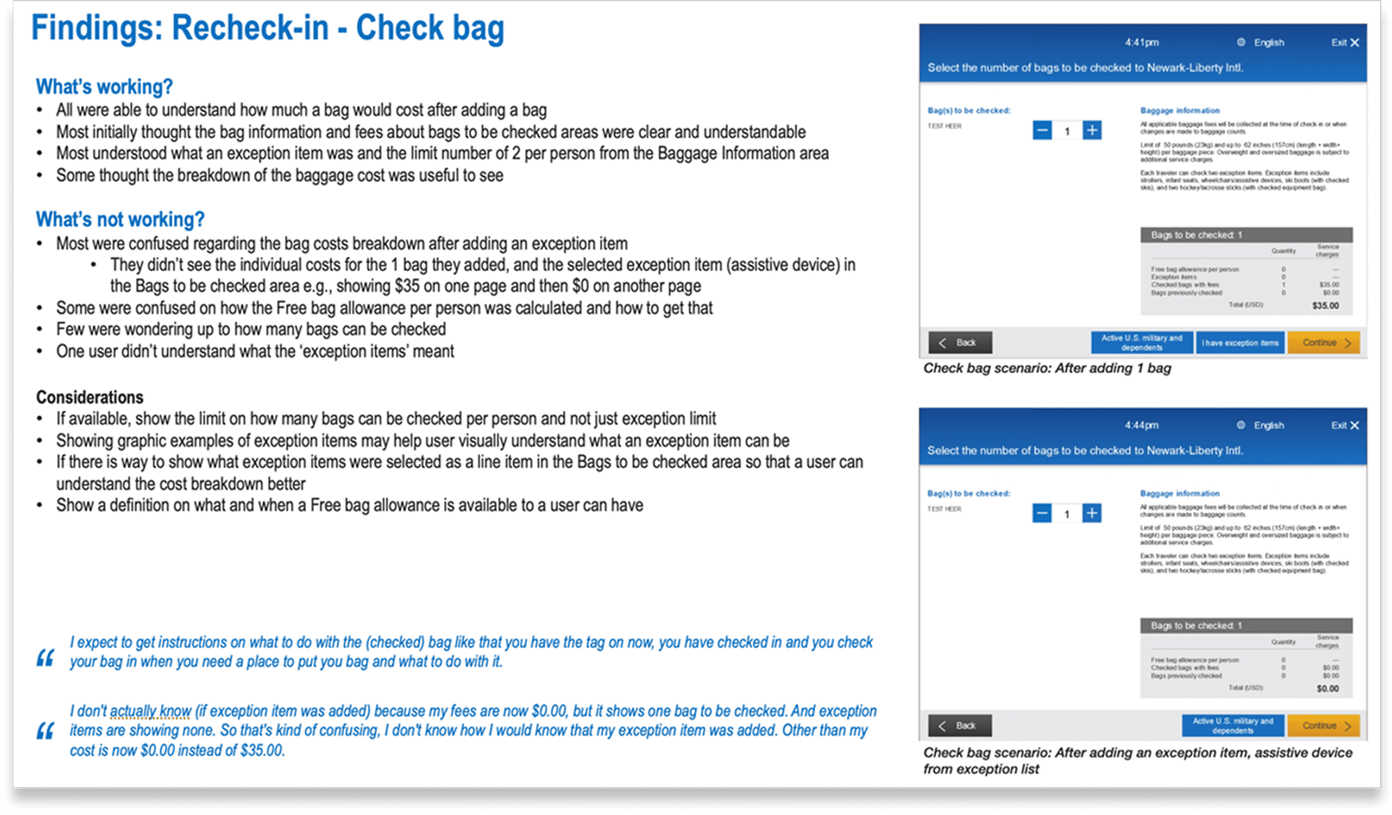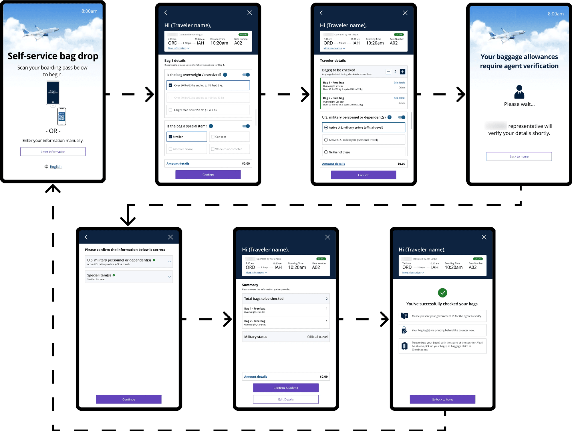 I redesigned the airport self-service kiosk experience for international flyers with complex documentation, military personnel with special allowances, and families with non-standard booking situations.