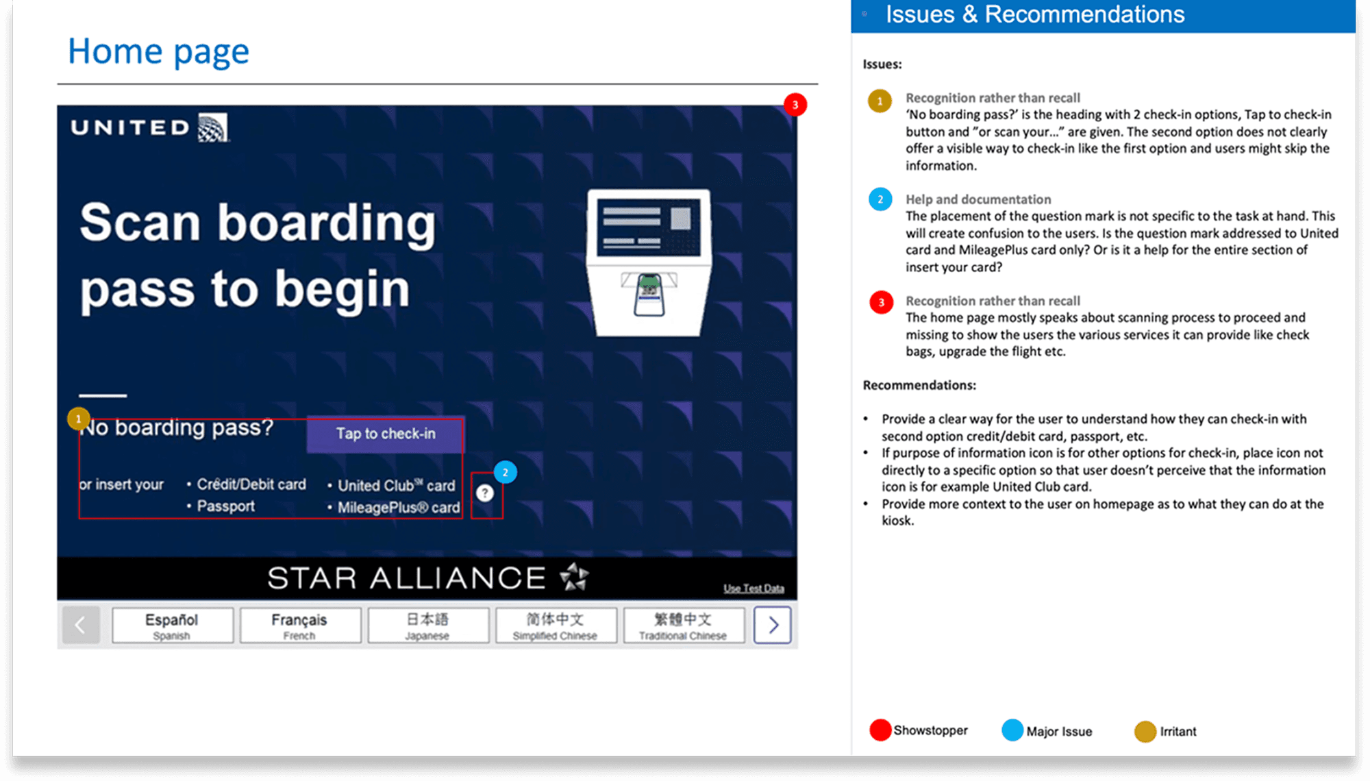 I conducted a systematic heuristic evaluation of the existing kiosk flow against Jakob Nielsen's 10 usability principles.